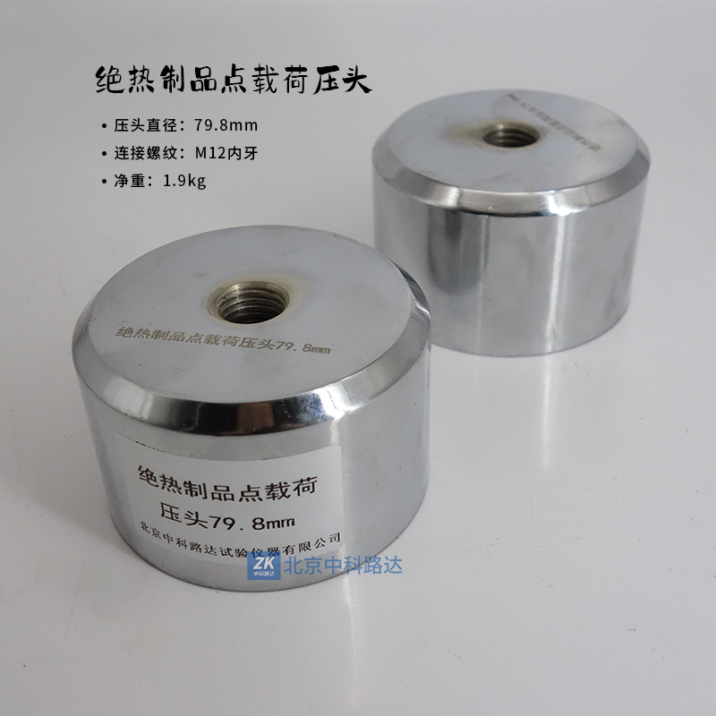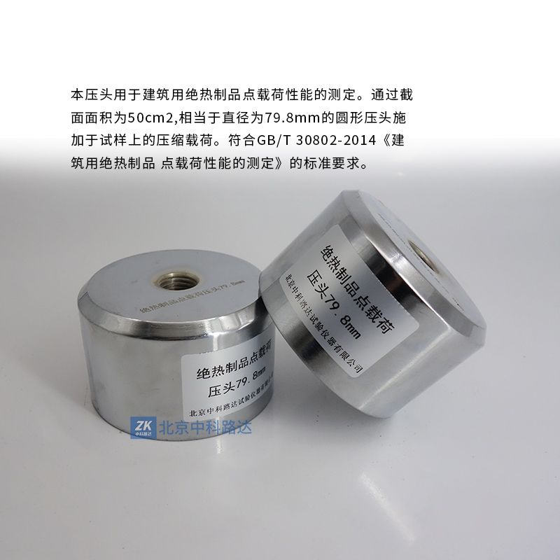 本壓頭用于建筑用絕熱制品點載荷性能的測定。通過截面面積為50cm2,相當于直徑為79.8mm的圓形壓頭施加于試樣上的壓縮載荷。符合GB/T 30802-2014《建筑用絕熱制品 點載荷性能的測定》的標準要求。