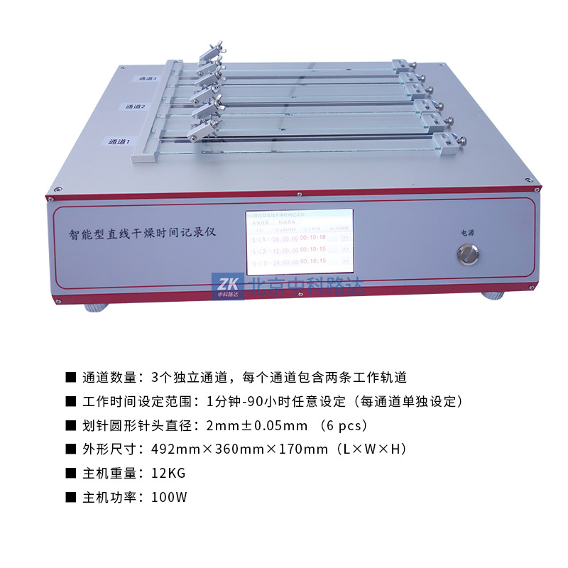 這是一款功能強(qiáng)大的智能型的直線干燥時間記錄儀,可以滿足不同干燥時間特性的樣品的全面分析。帶半球型觸點(diǎn)的劃桿安裝在滑架上。劃桿由滑架帶動,與新涂膜層接觸,由一端開始,在試樣上作縱向移動??赏ㄟ^儀器的“軌跡查詢”功能查看對應(yīng)軌跡的各個干燥階段。它有三個可以單獨(dú)設(shè)定任意運(yùn)行時間的通道(每個通道有兩條工作軌道),符合ASTM D 5895的標(biāo)準(zhǔn)要求。