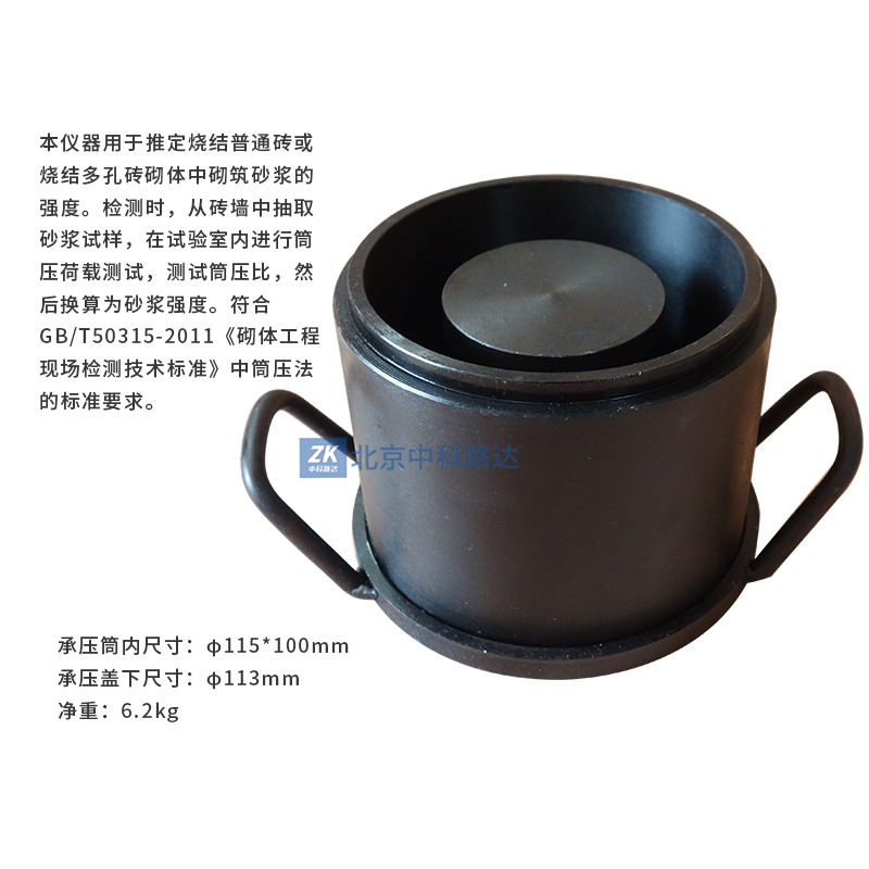 本儀器用于推定燒結(jié)普通磚或燒結(jié)多孔磚砌體中砌筑砂漿的強度。檢測時,從磚墻中抽取砂漿試樣,在試驗室內(nèi)進行筒壓荷載測試,測試筒壓比,然后換算為砂漿強度。符合GB/T50315-2011《砌體工程現(xiàn)場檢測技術(shù)標準》中筒壓法的標準要求。
