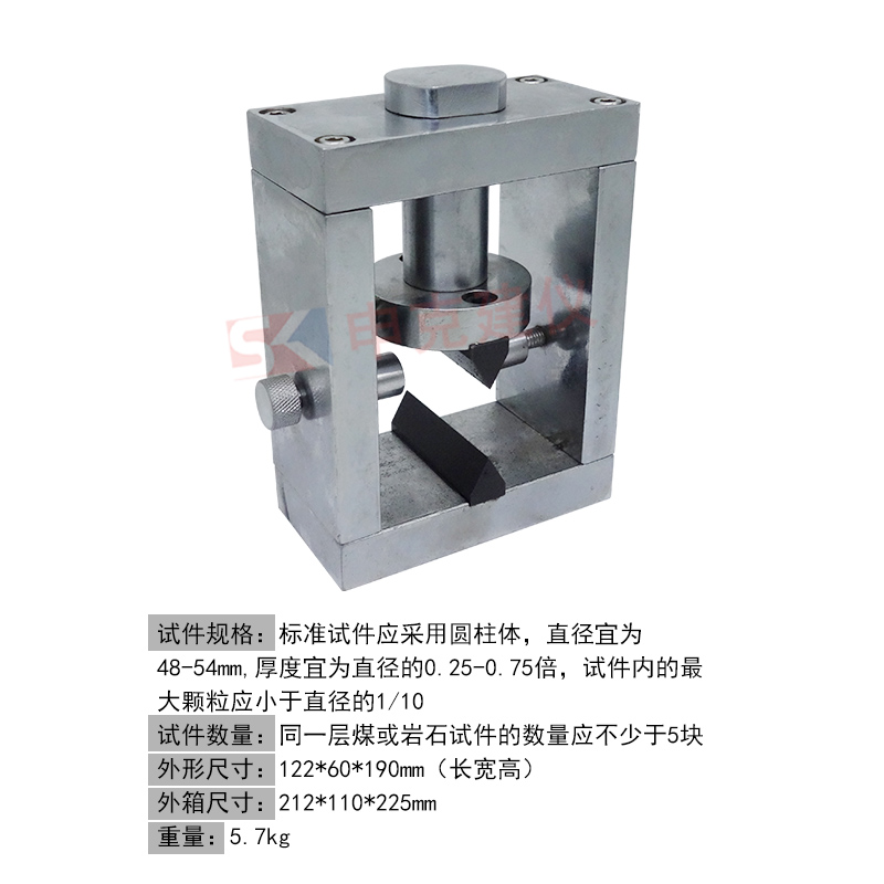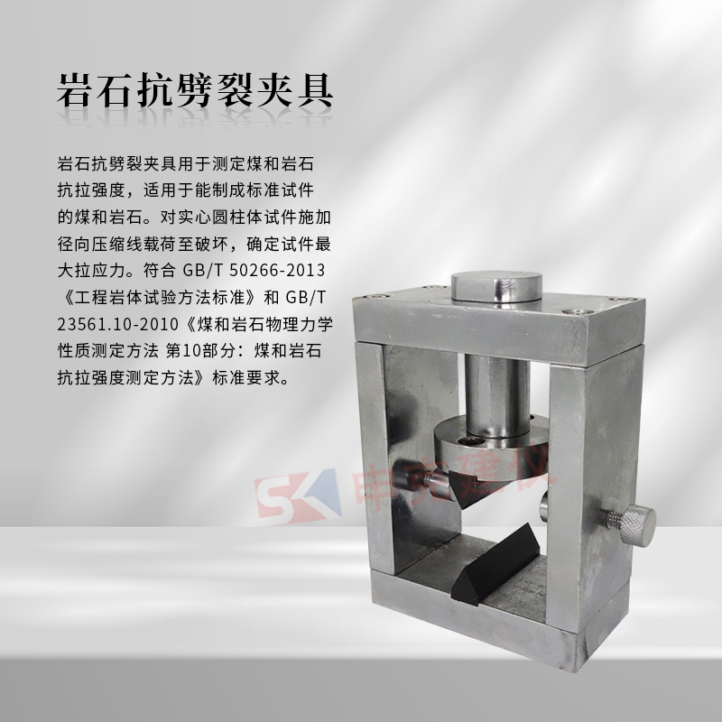 巖石抗劈裂夾具用于測(cè)定煤和巖石抗拉強(qiáng)度,適用于能制成標(biāo)準(zhǔn)試件的煤和巖石。對(duì)實(shí)心圓柱體試件施加徑向壓縮線載荷至破壞,確定試件最大拉應(yīng)力。符合 GB/T 50266-2013《工程巖體試驗(yàn)方法標(biāo)準(zhǔn)》和 GB/T 23561.10-2010《煤和巖石物理力學(xué)性質(zhì)測(cè)定方法 第10部分:煤和巖石抗拉強(qiáng)度測(cè)定方法》標(biāo)準(zhǔn)要求。
