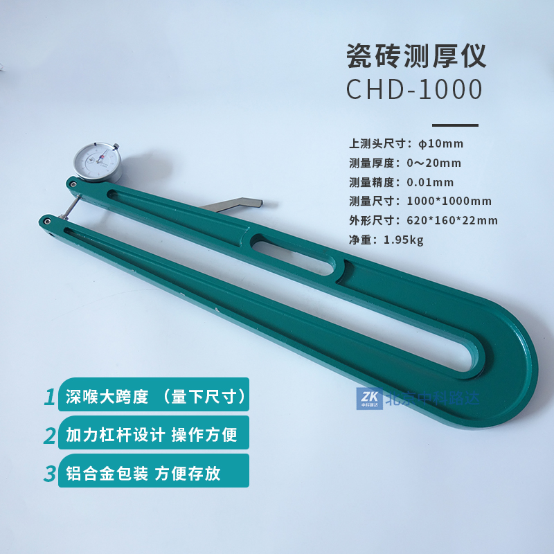 主要用于測量普通量具無法測量的大尺寸陶瓷磚的厚度,也可用于其他材料(如馬賽克、水泥磚等)產(chǎn)品厚度的測量。具有精度高,使用方便等優(yōu)點。符合GB/T 3810.2-2006《陶瓷磚試驗方法 第2部分 尺寸和表面質(zhì)量的檢驗》的標(biāo)準(zhǔn)要求。