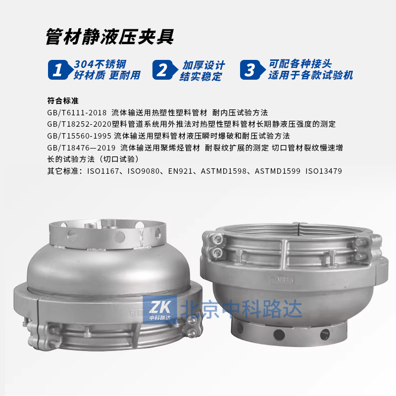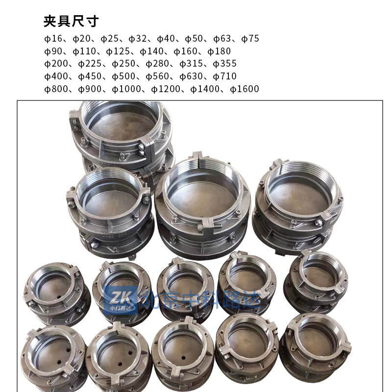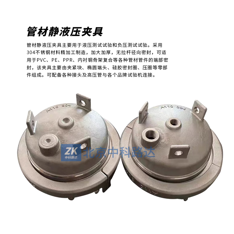 管材靜液壓夾具主要用于液壓測(cè)試試驗(yàn)和負(fù)壓測(cè)試試驗(yàn)。采用304不銹鋼材料精加工制造,加大加厚,無拉桿徑向密封,可適用于PVC、PE、PPR、內(nèi)襯鋼骨架復(fù)合等各種管材管件的端部密封,該夾具主要由夾緊塊、橢圓端頭、硅膠密封圈、壓圈等零部件組成。可配備各種接頭及高壓管與各個(gè)品牌試驗(yàn)機(jī)連接。