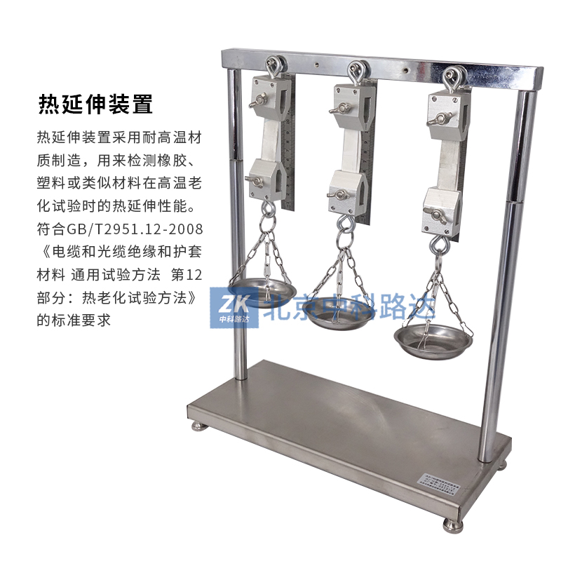 熱延伸裝置采用耐高溫材質(zhì)制造,用來(lái)檢測(cè)橡膠、塑料或類似材料在高溫老化試驗(yàn)時(shí)的熱延伸性能。符合GB/T2951.12-2008《電纜和光纜絕緣和護(hù)套材料 通用試驗(yàn)方法 第12部分:熱老化試驗(yàn)方法》的標(biāo)準(zhǔn)要求。采用鋁合金波紋夾具,夾持方便牢固;不銹鋼直尺,刻度清晰;多種配重砝碼,自由組合。...