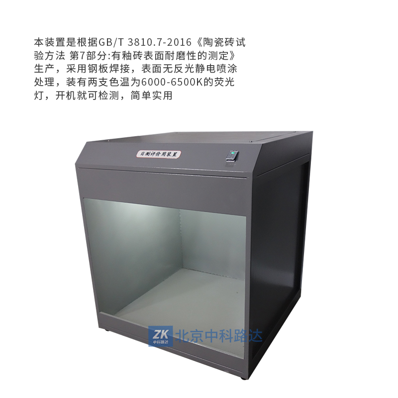 本裝置是根據(jù)GB/T 3810.7-2016《陶瓷磚試驗(yàn)方法 第7部分:有釉磚表面耐磨性的測(cè)定》生產(chǎn),采用鋼板焊接,表面無(wú)反光靜電噴涂處理,裝有兩支色溫為6000-6500K的熒光燈,開(kāi)機(jī)就可檢測(cè),簡(jiǎn)單實(shí)用。