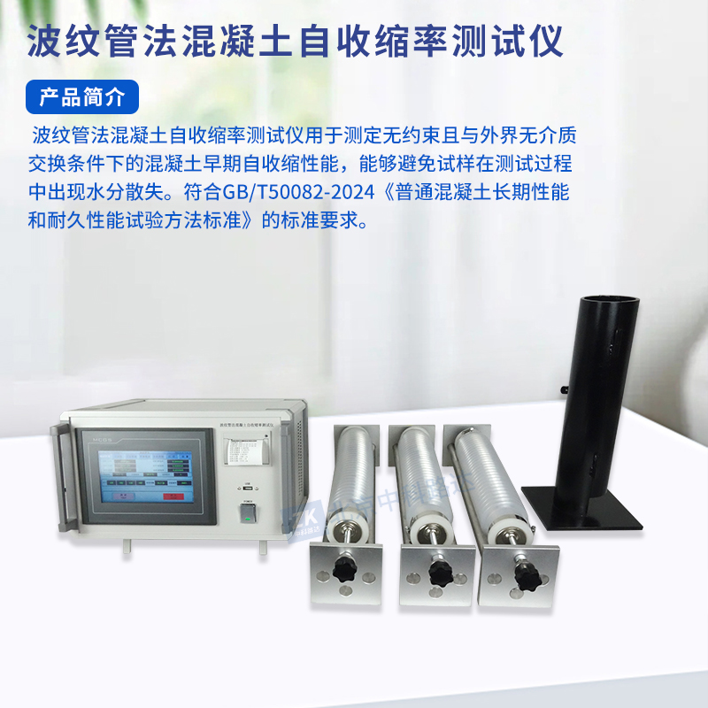 波紋管法混凝土自收縮率測(cè)試儀用于測(cè)定無約束且與外界無介質(zhì)交換條件下的混凝土早期自收縮性能,能夠避免試樣在測(cè)試過程中出現(xiàn)水分散失。符合GB/T50082-2024《普通混凝土長(zhǎng)期性能和耐久性能試驗(yàn)方法標(biāo)準(zhǔn)》的標(biāo)準(zhǔn)要求。