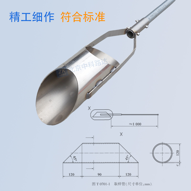 瀝青混合料取樣管用于拌和廠、運(yùn)料車、施工現(xiàn)場(chǎng)進(jìn)行熱拌(溫拌)瀝青混合料、冷拌瀝青混合料、稀漿混合料和碎石封層等松散瀝青混合料取樣。取樣管采購不銹鋼材料,手柄采用鍍鋅管。依據(jù)JTG 3410-2025《公路工程瀝青及瀝青混合料試驗(yàn)規(guī)程》中T0701-2025瀝青混合料取樣方法的標(biāo)準(zhǔn)要求。