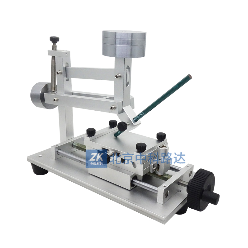 本儀器主要由鉛筆架和試驗(yàn)臺組成,鉛筆架與立柱等組成四連桿結(jié)構(gòu),保證了砝碼的重量垂直作用于鉛筆芯與試驗(yàn)臺的交點(diǎn)上,并使鉛筆與試驗(yàn)臺成45°