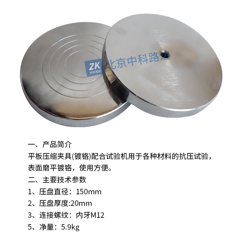 平板壓縮夾具(鍍鉻)配合試驗機(jī)用于各種材料的抗壓試驗,表面磨平鍍鉻,使用方便。