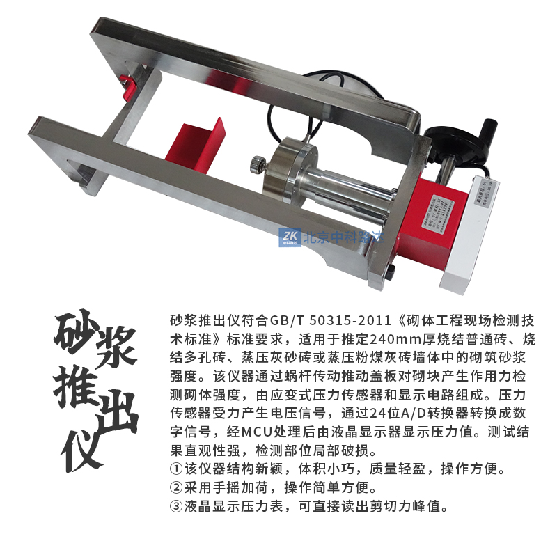 砂漿推出儀符合GB/T 50315-2011《砌體工程現(xiàn)場(chǎng)檢測(cè)技術(shù)標(biāo)準(zhǔn)》標(biāo)準(zhǔn)要求,適用于推定240mm厚燒結(jié)普通磚、燒結(jié)多孔磚、蒸壓灰砂磚或蒸壓粉煤灰磚墻體中的砌筑砂漿強(qiáng)度。該儀器通過(guò)蝸桿傳動(dòng)推動(dòng)蓋板對(duì)砌塊產(chǎn)生作用力檢測(cè)砌體強(qiáng)度,由應(yīng)變式壓力傳感器和顯示電路組成。壓力傳感器受力產(chǎn)生電壓信號(hào),通過(guò)24位A/D轉(zhuǎn)換器轉(zhuǎn)換成數(shù)字信號(hào),經(jīng)MCU處理后由液晶顯示器顯示壓力值。測(cè)試結(jié)果直觀性強(qiáng),檢測(cè)部位局部破損。