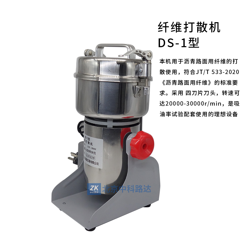 本機(jī)用于瀝青路面用纖維的打散使用,符合JT/T 533-2020《瀝青路面用纖維》的標(biāo)準(zhǔn)要求。采用 四刀片刀頭,轉(zhuǎn)速可達(dá)20000-30000r/min,是吸油率試驗(yàn)配套使用的理想設(shè)備。