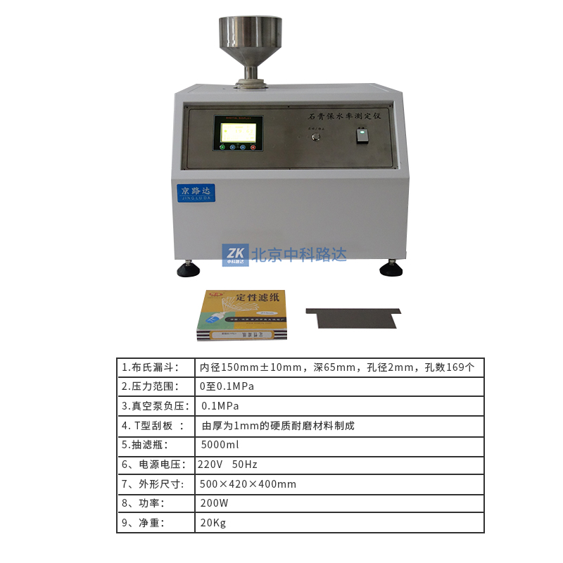 一、產(chǎn)品簡(jiǎn)介 本儀器符合GB/T28627-2012《粉刷石膏》標(biāo)準(zhǔn)要求,用來(lái)檢測(cè)粉刷石膏保水率,同時(shí)也可用于水泥、砂漿保水率試驗(yàn)。儀器采用智能數(shù)顯儀表,設(shè)置所需壓力及時(shí)間后自動(dòng)加壓,自動(dòng)計(jì)時(shí),自動(dòng)保壓,自動(dòng)停機(jī),一鍵完成操作,無(wú)需人工值守調(diào)節(jié)壓力,簡(jiǎn)單快捷。二、主要技術(shù)參數(shù) 1.布氏漏斗:內(nèi)徑150mm10mm,深65mm,孔徑2mm,孔數(shù)169個(gè)2.壓力范圍:0至0.1MPa3.真空泵負(fù)...