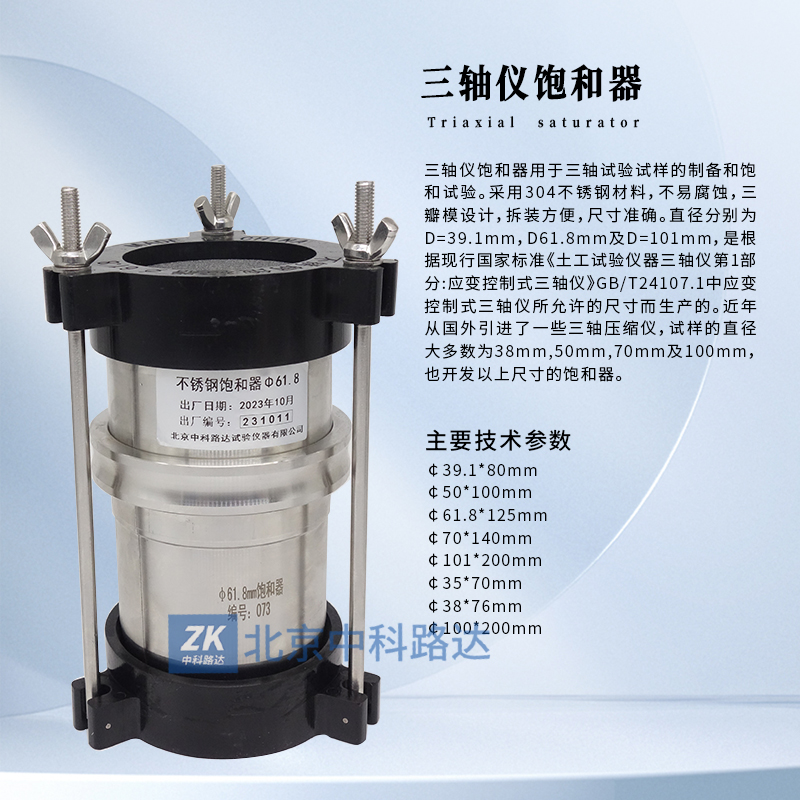 三軸儀飽和器用于三軸試驗試樣的制備和飽和試驗。采用304不銹鋼材料,不易腐蝕,三瓣模設(shè)計,拆裝方便,尺寸準確。直徑分別為D=39.1mm,D61.8mm及D=101mm,是根據(jù)現(xiàn)行國家標準《土工試驗儀器三軸儀第1部分:應變控制式三軸儀》GB/T24107.1中應變控制式三軸儀所允許的尺寸而生產(chǎn)的。近年從國外引進了一些三軸壓縮儀,試樣的直徑大多數(shù)為38mm,50mm,70mm及100mm,也開了發(fā)以上尺寸的飽和器。