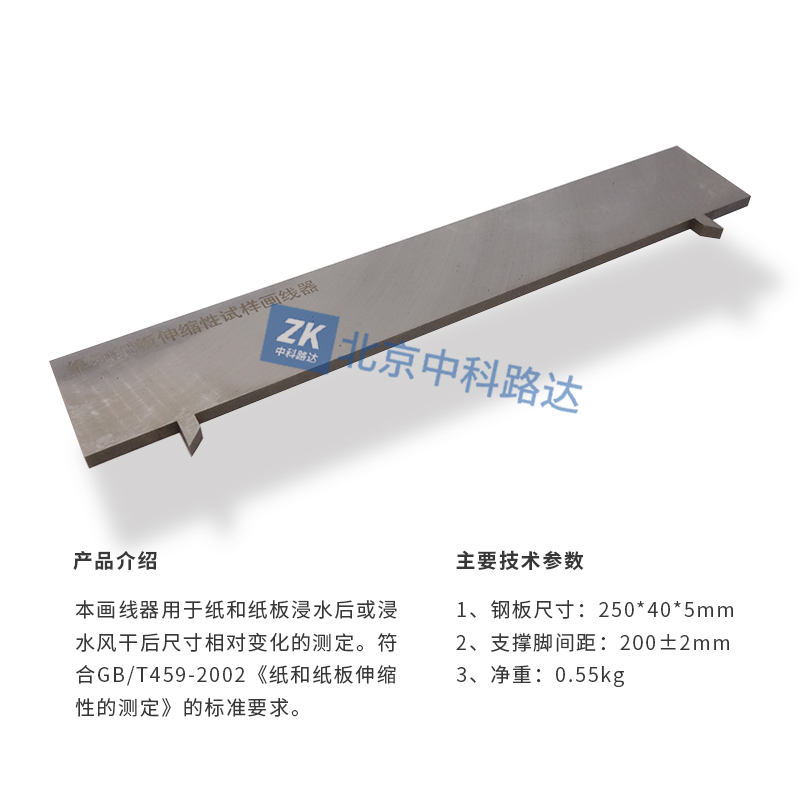 本畫線器用于紙和紙板浸水后或浸水風(fēng)干后尺寸相對變化的測定。符合GB/T459-2002《紙和紙板伸縮性的測定》的標(biāo)準(zhǔn)要求。
