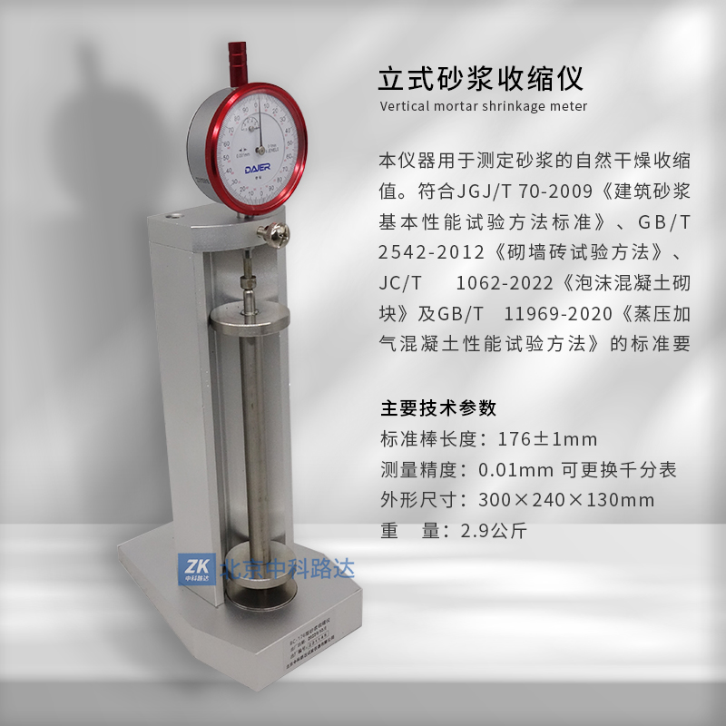 本儀器用于測(cè)定砂漿的自然干燥收縮值。符合JGJ/T 70-2009《建筑砂漿基本性能試驗(yàn)方法標(biāo)準(zhǔn)》、GB/T 2542-2012《砌墻磚試驗(yàn)方法》、JC/T 1062-2022《泡沫混凝土砌塊》及GB/T 11969-2020《蒸壓加氣混凝土性能試驗(yàn)方法》的標(biāo)準(zhǔn)要求。