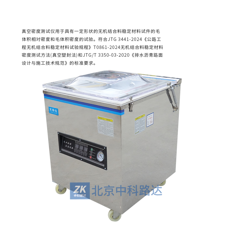真空密度測(cè)試儀用于具有一定形狀的無(wú)機(jī)結(jié)合料穩(wěn)定材料試件的毛體積相對(duì)密度和毛體積密度的試驗(yàn)。符合JTG 3441-2024《公路工程無(wú)機(jī)結(jié)合料穩(wěn)定材料試驗(yàn)規(guī)程》T0861-2024無(wú)機(jī)結(jié)合料穩(wěn)定材料密度測(cè)試方法(真空塑封法)JTG/T 3350-03-2020《排水瀝青路面設(shè)計(jì)與施工技術(shù)規(guī)范》的標(biāo)準(zhǔn)要求。