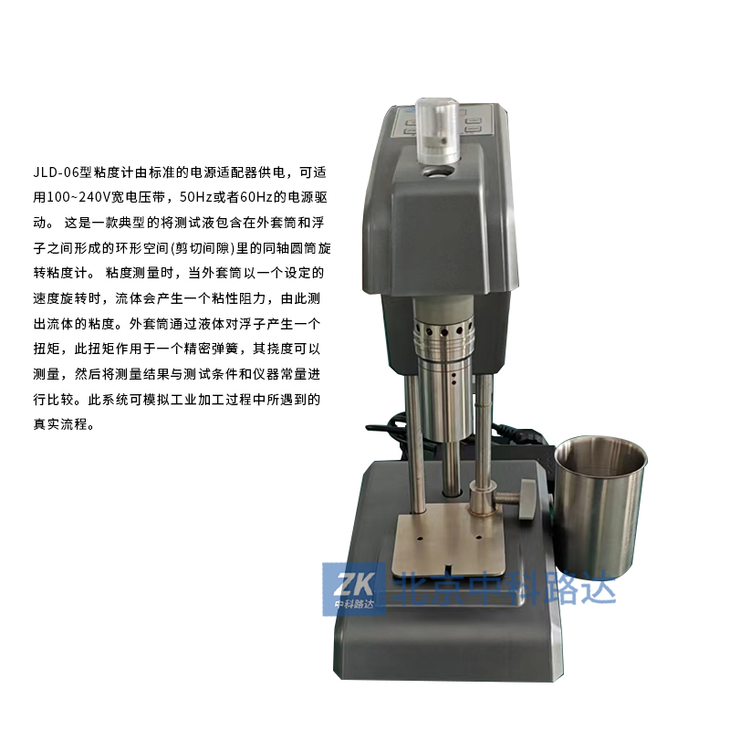 JLD-06型粘度計由標(biāo)準(zhǔn)的電源適配器供電,可適用100~240V寬電壓帶,50Hz或者60Hz的電源驅(qū)動。 這是一款典型的將測試液包含在外套筒和浮子之間形成的環(huán)形空間(剪切間隙)里的同軸圓筒旋轉(zhuǎn)粘度計。 粘度測量時,當(dāng)外套筒以一個設(shè)定的速度旋轉(zhuǎn)時,流體會產(chǎn)生一個粘性阻力,由此測出流體的粘度。外套筒通過液體對浮子產(chǎn)生一個扭矩,此扭矩作用于一個精密彈簧,其撓度可以測量,然后將測量結(jié)果與測試條件和儀器常量進行比較。此系統(tǒng)可模擬工業(yè)加工過程中所遇到的真實流程。