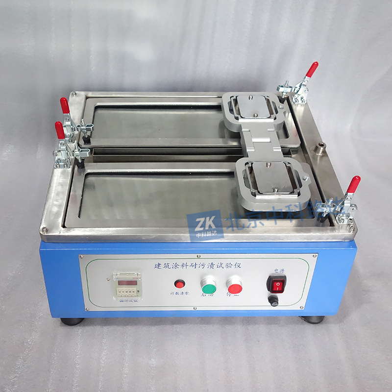 耐污漬試驗(yàn)儀用于實(shí)驗(yàn)室評價(jià)內(nèi)墻涂料的耐污漬性能。不同的涂料干膜表面在受到污染后,污漬從干膜表面去除的難易程度不同,這種難易程度反映了干膜表面的耐污漬能力,即耐污漬性。目前使用較多的測試方法是基于ASTM D4828和GB/T9780-2013標(biāo)準(zhǔn),將涂膜刮在黑色塑料片上在標(biāo)準(zhǔn)狀態(tài)下養(yǎng)護(hù)7天,測試干膜的反射系數(shù)后再在干膜上涂布污漬,一定時(shí)間后在耐污漬試驗(yàn)機(jī)上擦洗一定次數(shù),然后沖洗晾干涂膜,測試擦洗區(qū)域的反射系數(shù)。通過對比前后二次的反射系數(shù)來評價(jià)涂膜的耐污漬性能。本機(jī)為雙磨頭組件配置。