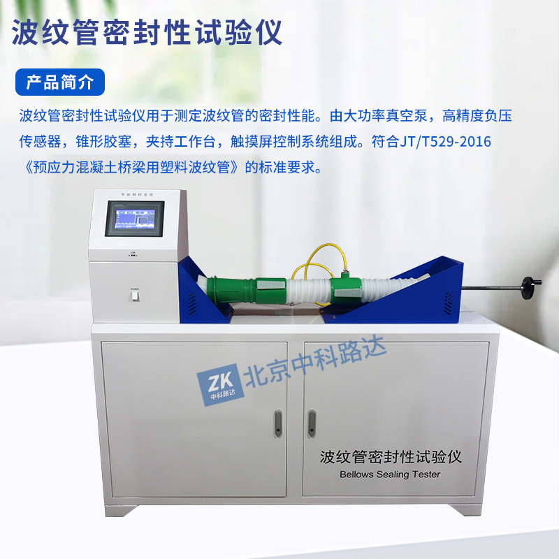 波紋管密封性試驗(yàn)儀用于測(cè)定波紋管的密封性能。由大功率真空泵,高精度負(fù)壓傳感器,錐形膠塞,夾持工作臺(tái),觸摸屏控制系統(tǒng)組成。符合JT/T529-2016《預(yù)應(yīng)力混凝土橋梁用塑料波紋管》的標(biāo)準(zhǔn)要求。