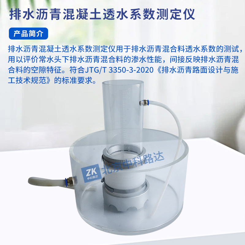 排水瀝青混凝土透水系數(shù)測定儀用于排水瀝青混合料透水系數(shù)的測試,用以評價常水頭下排水瀝青混合料的滲水性能,間接反映排水瀝青混合料的空隙特征。符合JTG/T 3350-3-2020《排水瀝青路面設(shè)計與施工技術(shù)規(guī)范》的標(biāo)準(zhǔn)要求。