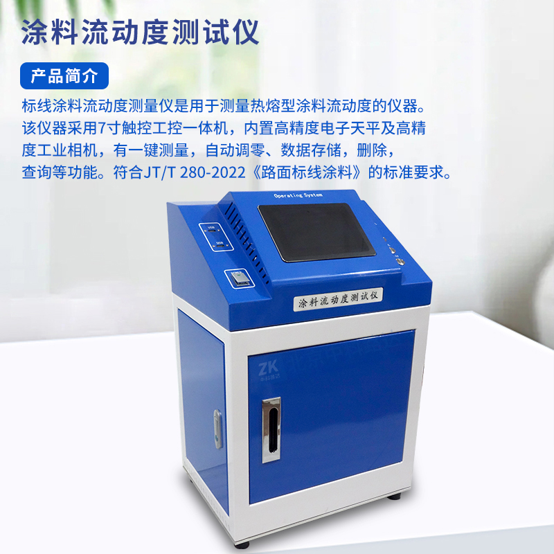 標(biāo)線涂料流動度測量儀是用于測量熱熔型涂料流動度的儀器。該儀器采用7寸觸控工控一體機(jī),內(nèi)置高精度電子天平及高精度工業(yè)相機(jī),有一鍵測量,自動調(diào)零、數(shù)據(jù)存儲,刪除,查詢等功能。符合JT/T 280-2022《路面標(biāo)線涂料》的標(biāo)準(zhǔn)要求。