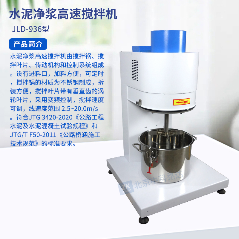 水泥凈漿高速攪拌機由攪拌鍋、攪拌葉片、傳動機構(gòu)和控制系統(tǒng)組成。設(shè)有進料口,加料方便,可定時,攪拌鍋的材質(zhì)為不銹鋼制成,拆裝方便,攪拌葉片帶有垂直齒的渦輪葉片,采用變頻控制,攪拌速度可調(diào),線速度范圍 2.5~20.0m/s。符合JTG 3420-2020《公路工程水泥及水泥混凝土試驗規(guī)程》和JTG/T F50-2011《公路橋涵施工技術(shù)規(guī)范》的標準要求。